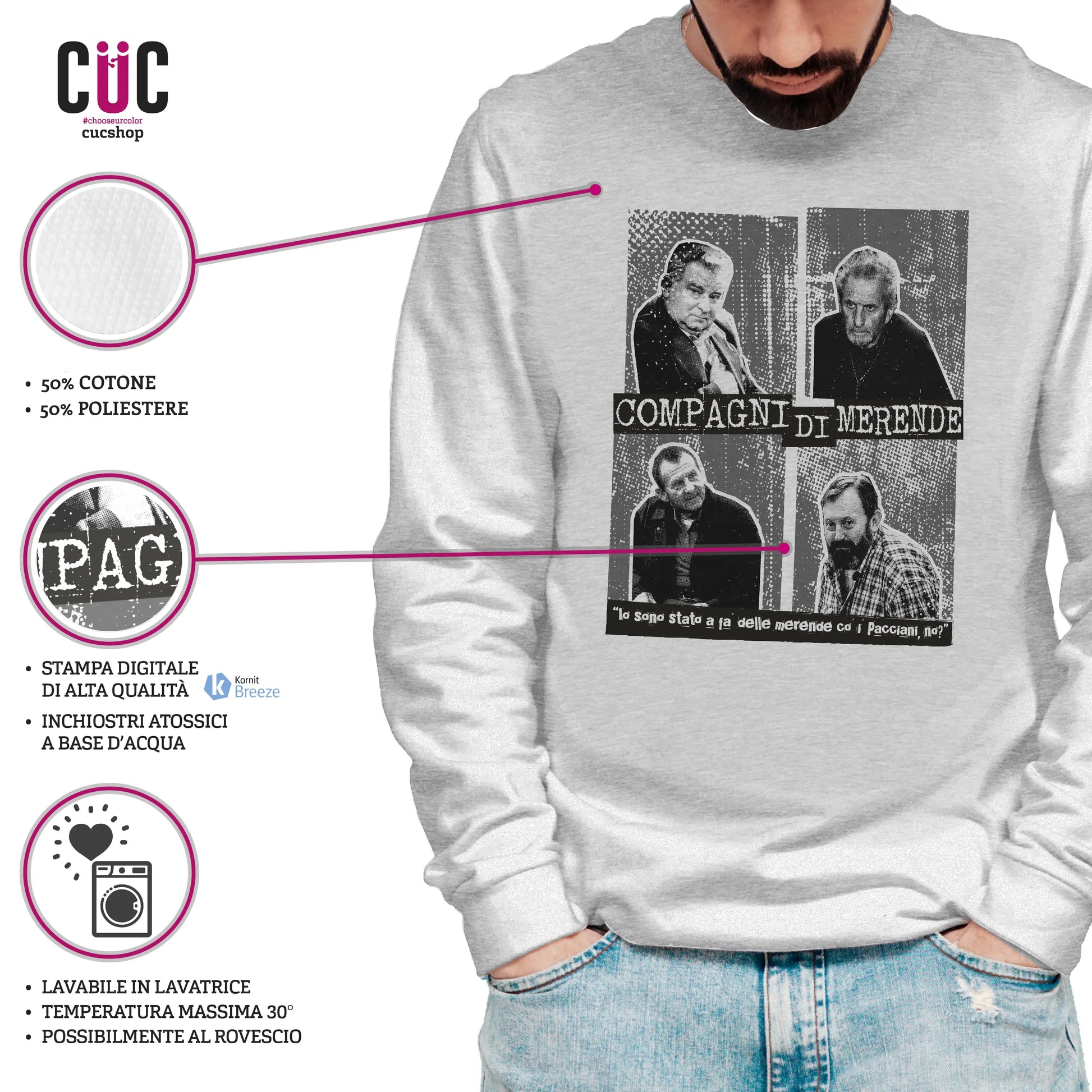 La nostra felpa girocollo ha il pregio di adattarsi facilmente a tutti, ma per essere totalmente soddisfatti, vi consigliamo di scegliere con attenzione la taglia più adatta dalla pagina guida alle taglie a questo link: https://www.cucshop.com/pages/guida-alle-taglie-1