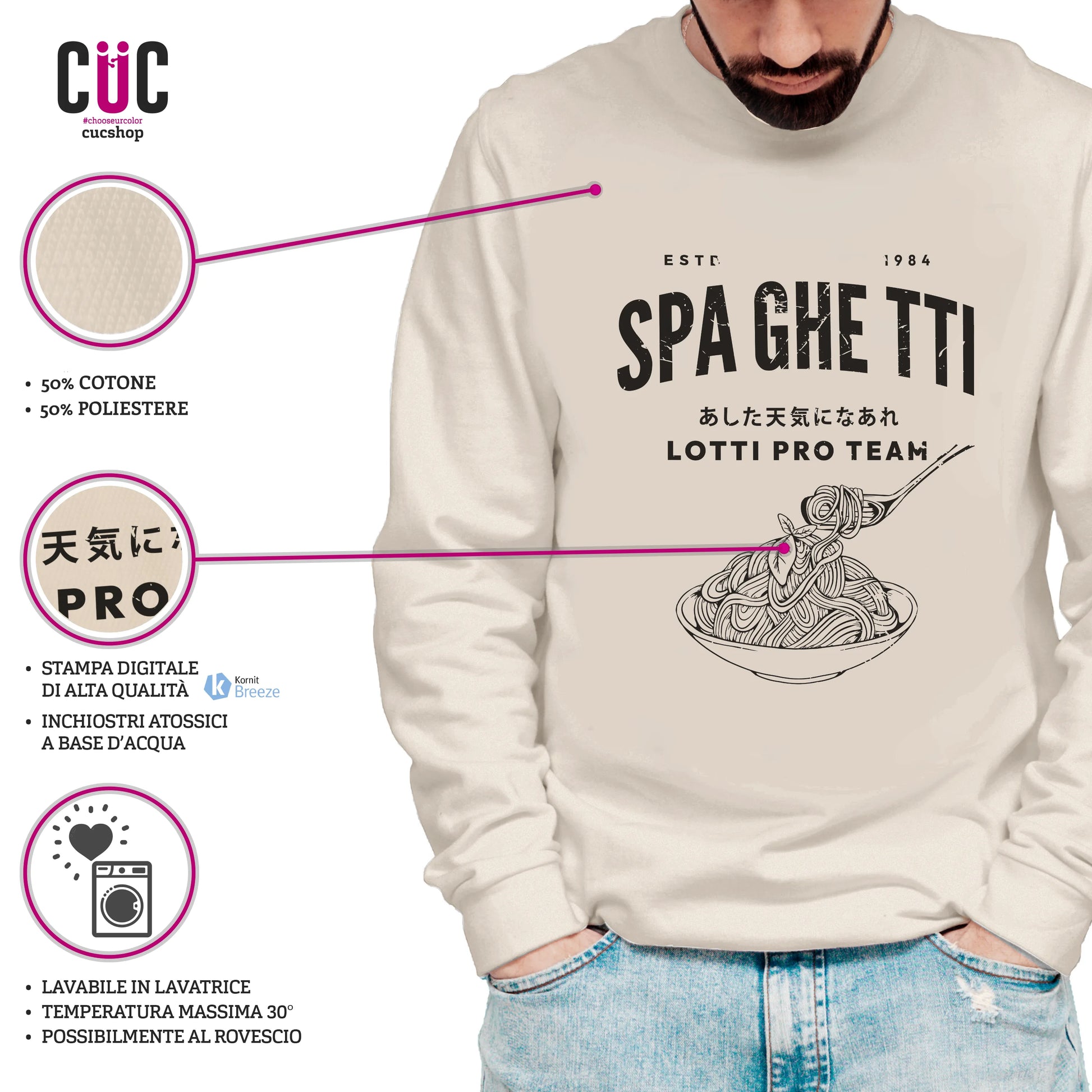 La nostra felpa girocollo ha il pregio di adattarsi facilmente a tutti, ma per essere totalmente soddisfatti, vi consigliamo di scegliere con attenzione la taglia più adatta dalla pagina guida alle taglie a questo link: https://www.cucshop.com/pages/guida-alle-taglie-1